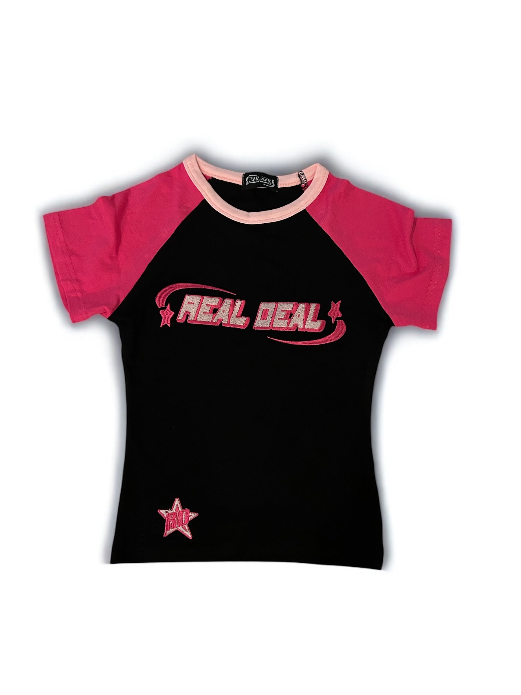 - A soft, breathable cotton crop top with the signature Real Deal logo across the chest